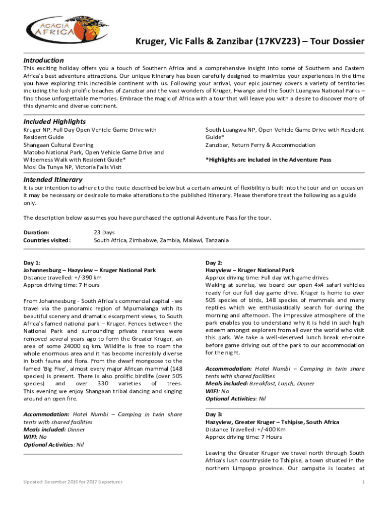 Kruger, Vic Falls & Zanzibar (17KVZ23) Tour Dossier Introduction This exciting holiday offers you a touch of Southern Africa and a comprehensive insight into some of Southern and Eastern Africas best