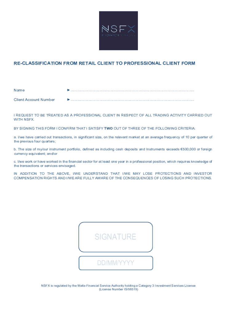 RECLASSIFICATION FROM RETAIL CLIENT TO PROFESSIONAL CLIENT Forename. Client Account Number. I REQUEST TO BE TREATED AS A PROFESSIONAL CLIENT IN RESPECT OF ALL TRADING ACTIVITY CARRIED OUT WITH NSF.