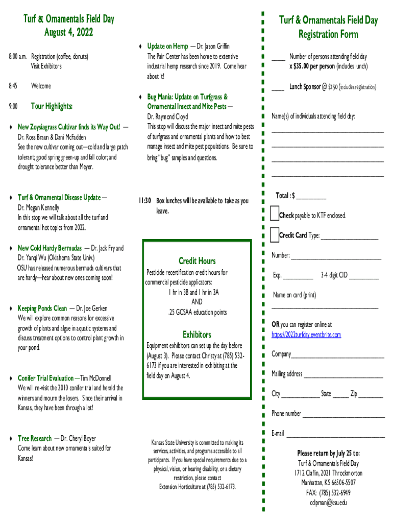 Turf & Ornamentals Field DayKState Research & Extension Horticulture 1712 Claflin, 2021 Throckmorton Plant Sciences Cntr. Manhattan, KS 665065507 (785) 5326173The turf and ornamentals field day program