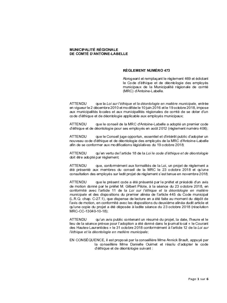 MUNICIPALIT RGIONALE DE COMT DANTOINELABELLERGLEMENT NUMRO 473 Abrogeant et remplaant le rglement 469 et dictant le Code dthique et de dontologie des employs municipaux de la Municipalit rgionale