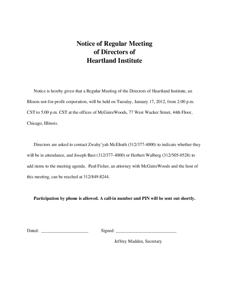 Get the free Notice of Regular Meeting of Directors of Heartland Institute