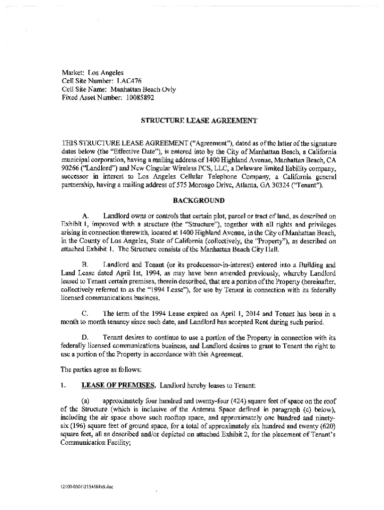 This document outlines the Structure Lease Agreement between the City of Manhattan Beach and New Singular Wireless PCS, LLC, detailing property and premises descriptions, authorization, and provisions.