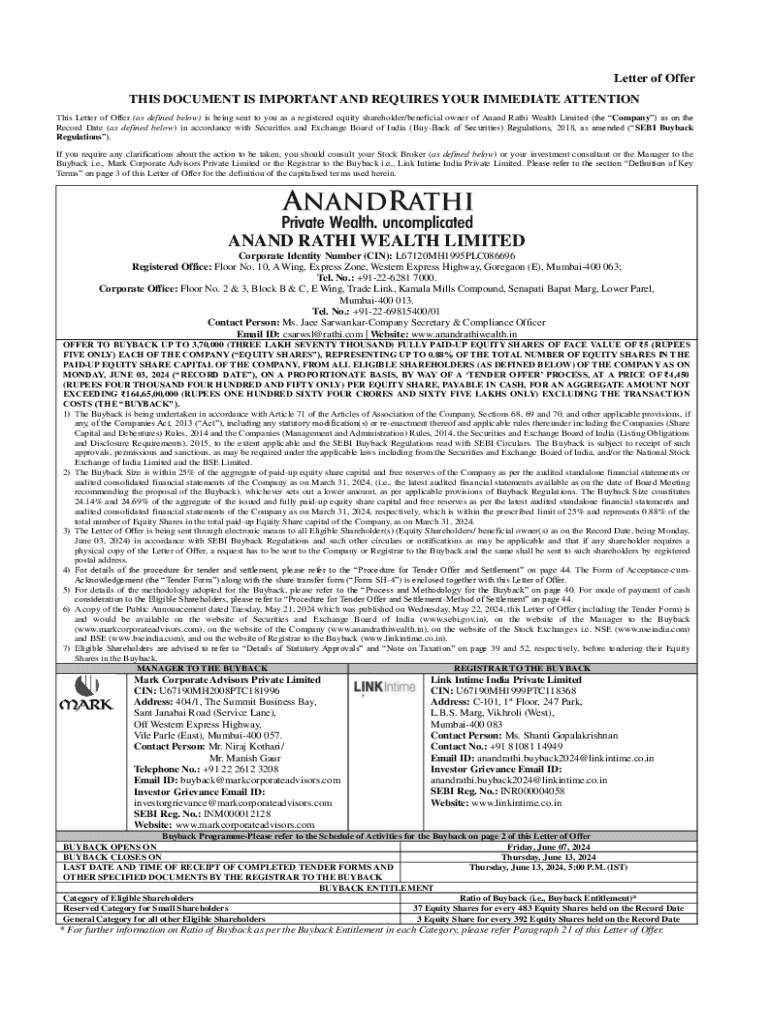 Letter of Offer THIS DOCUMENT IS IMPORTANT AND REQUIRES YOUR IMMEDIATE ATTENTION This Letter of Offer (as defined below) is being sent to you as a registered equity shareholder/beneficial owner of