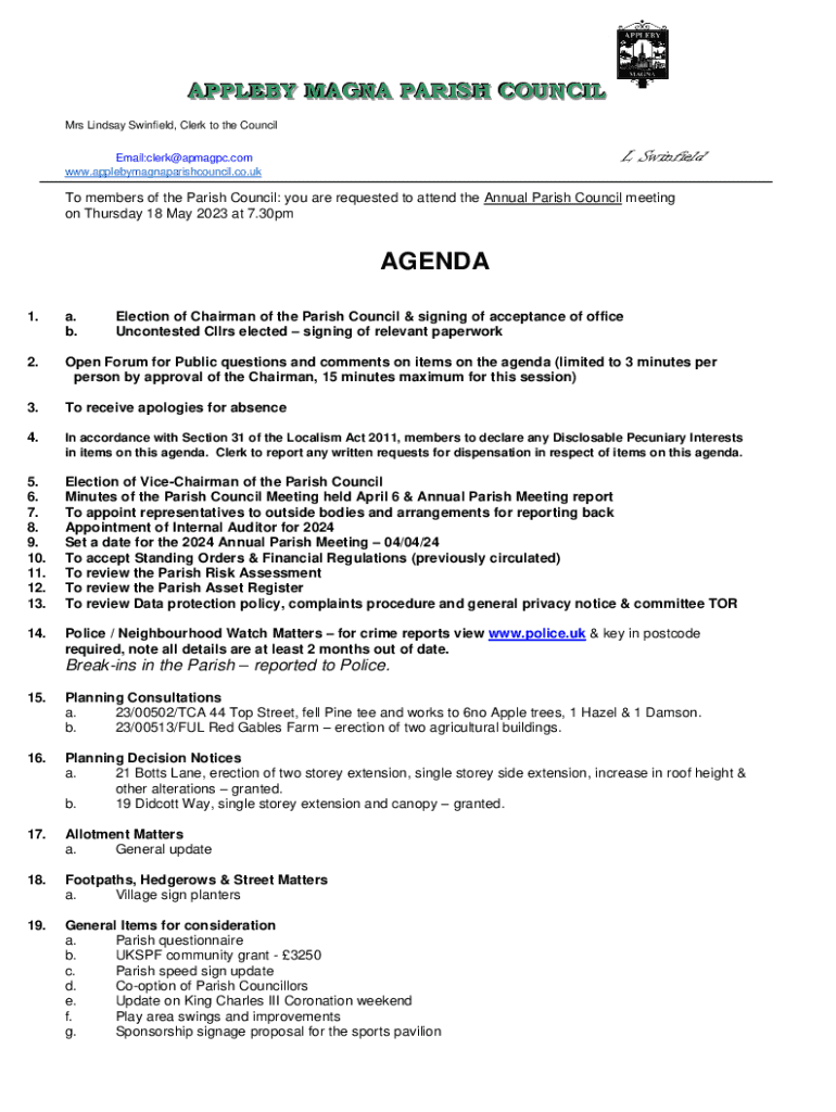 Detailed agenda for the Appleby Magma Parish Council Annual Meeting on May 18, 2023, covering elections, public forum, planning decisions, and more.