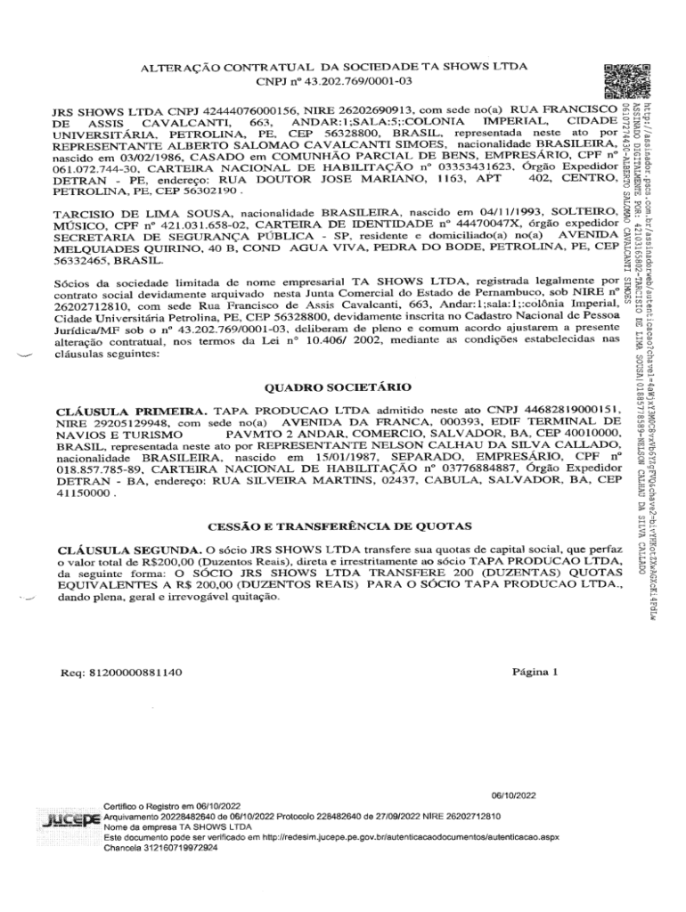 A L T E R A O C O N T R A T U A L D A SOCTEDADE T A SH O W S L T D A CNPJ n 4 3.2 0 2 .7 6 9 /0 0 0 1 0 3 Bi jrSSH O W S L T D A CNPJ 4 2 4 4 4 0 76 0 00 15 6 , NIRE 262 02 6 90 9 13 , com sede no(a)