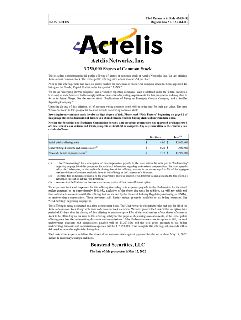 Filed Pursuant to Rule 424(b)(4) Registration No. 333264321PROSPECTUSActelis Networks, Inc. 3,750,000 Shares of Common Stock This is a firm commitment initial public offering of shares of common stock