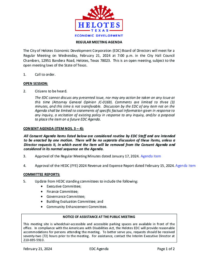 REGULAR MEETING AGENDA The City of Helotes Economic Development Corporation (EDC) Board of Directors will meet for a Regular Meeting on Wednesday, February 21, 2024 at 7:00 p.m. in the City Hall Council