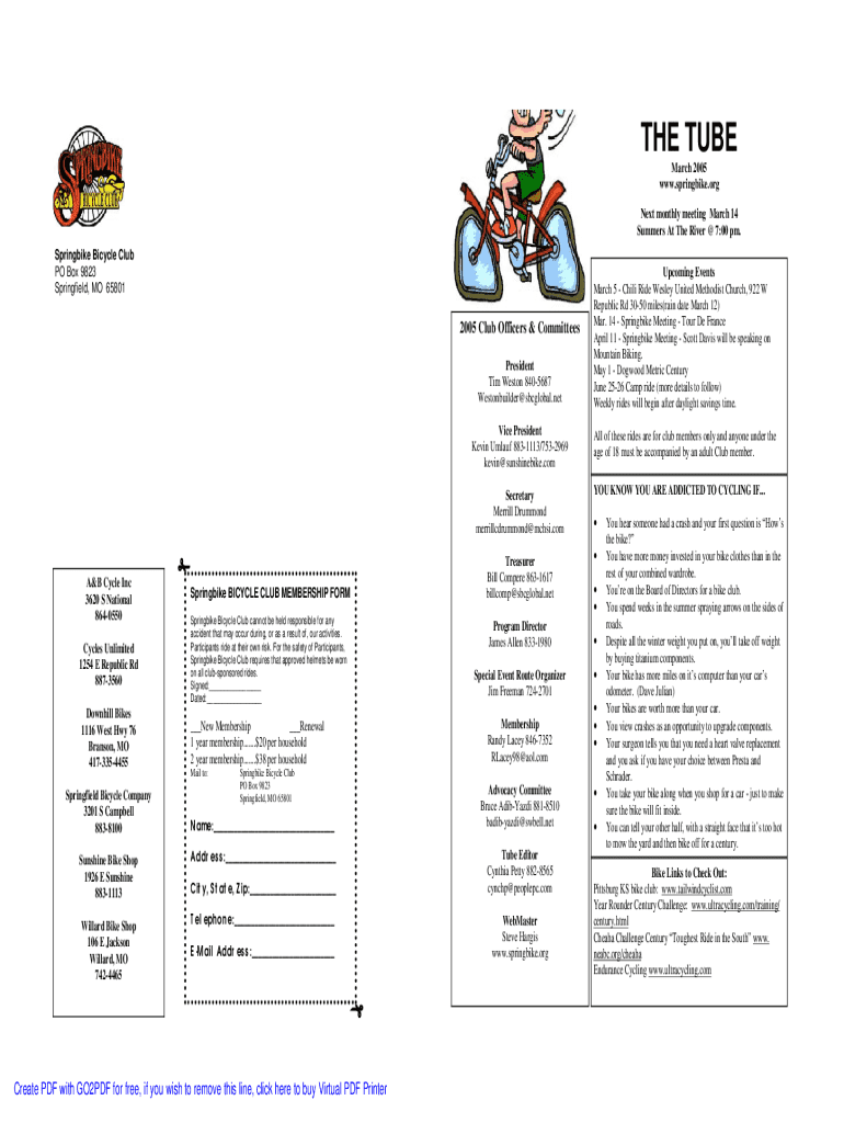 THE TUBE March 2005 www.springbike.orgNext monthly meeting March 14 Summers At The River @ 7:00 pm. Springbike Bicycle Club PO Box 9823 Springfield, MO 658012005 Club Officers & Committees President