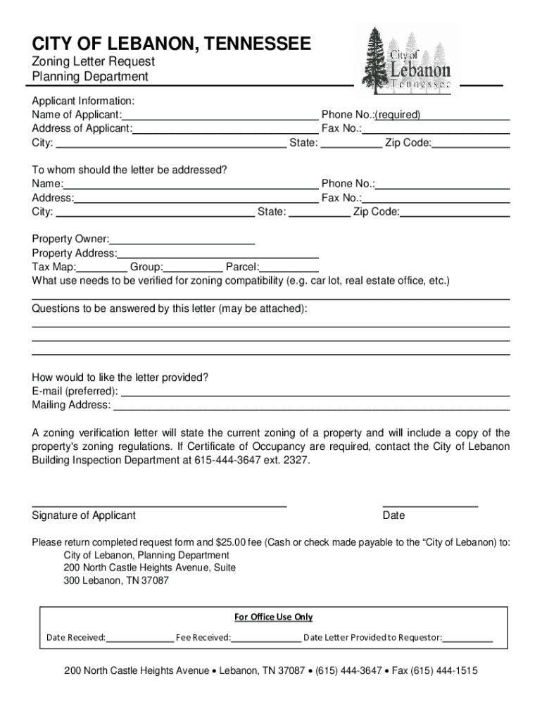CITY OF LEBANON, TENNESSEE Zoning Letter Request Planning Department Applicant Information: Name of Applicant: Address of Applicant: City:Phone No.:(required) Fax No.: State: Zip Code:To whom should