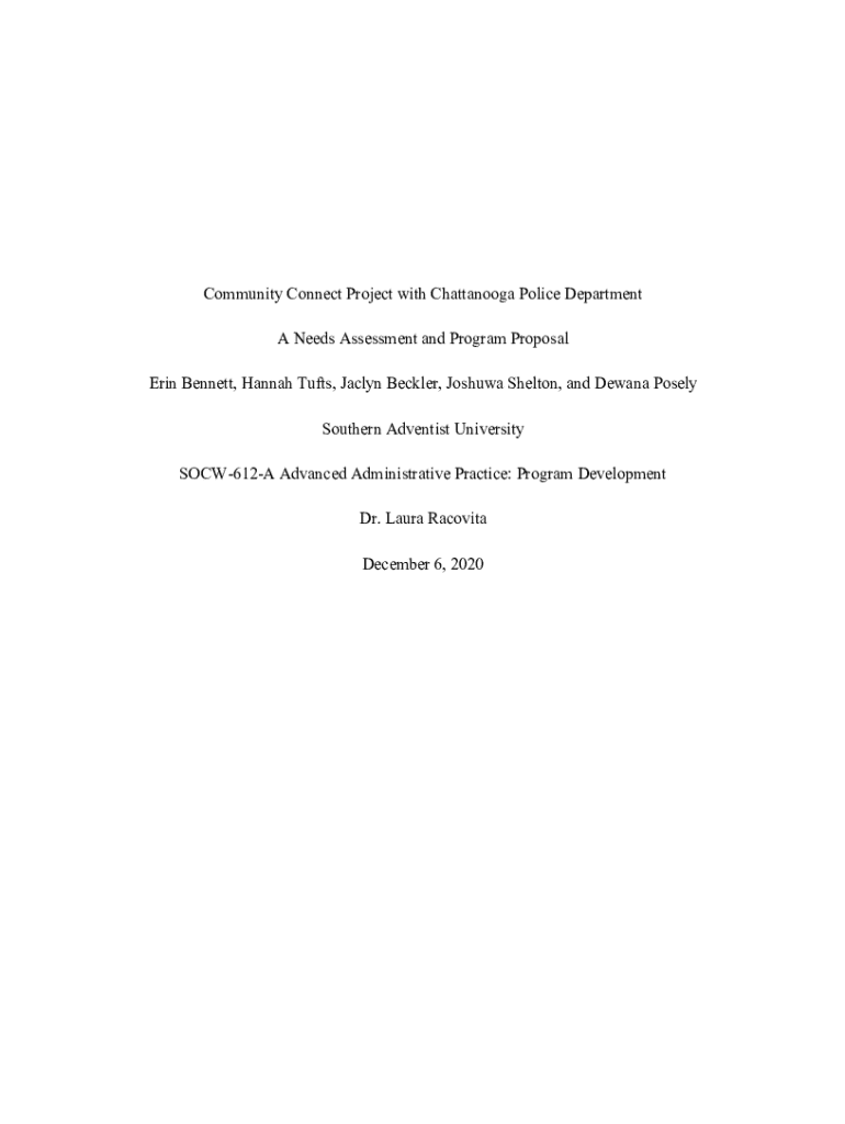 This proposal outlines the Community Connect Project aimed at addressing racial inequalities in police violence within the Chattanooga Police Department, focusing on community policing and training.