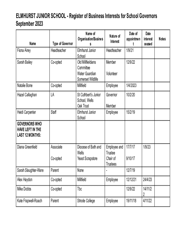 ELMHURST JUNIOR SCHOOL Register of Business Interests for School Governors