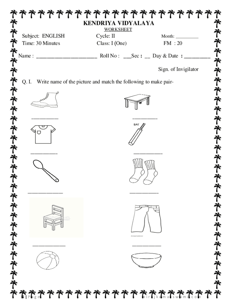 Class: I (One)Month: ___FM : 20Name : ___ Roll No : ___Sec : __ Day & Date : ___
