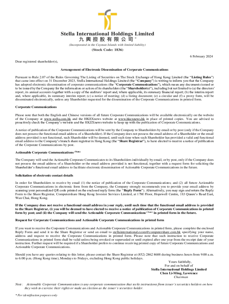 6 February 2024 Dear registered shareholder(s), Arrangement of Electronic Dissemination of Corporate Communications Pursuant to Rule 2.07 of the Rules Governing The Listing of Securities on The Stock