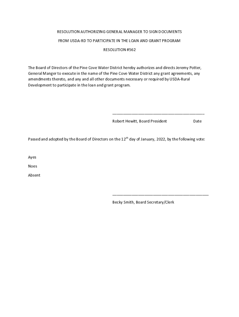 RESOLUTION AUTHORIZING GENERAL MANAGER TO SIGN DOCUMENTS FROM USD ARD TO PARTICIPATE IN THE LOAN AND GRANT PROGRAM RESOLUTION #562The Board of Directors of the Pine Cove Water District hereby authorizes