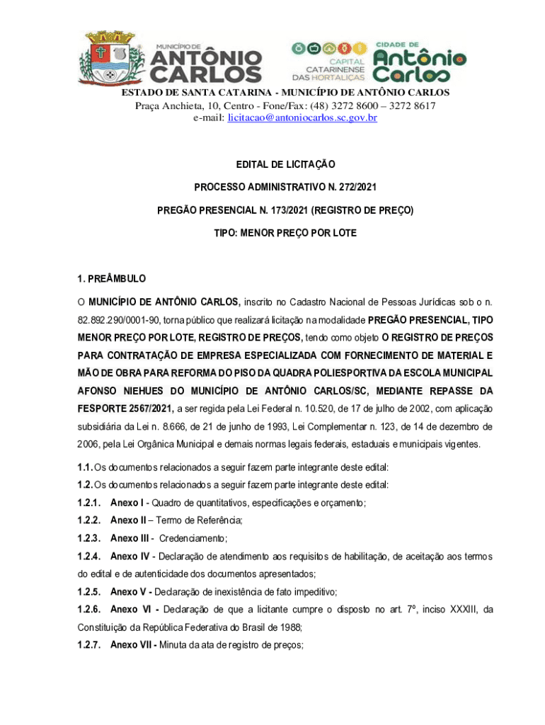 Obtenha o gratuito 3272 8617 e-mail: licitacaoantoniocarlos.sc.gov. ...