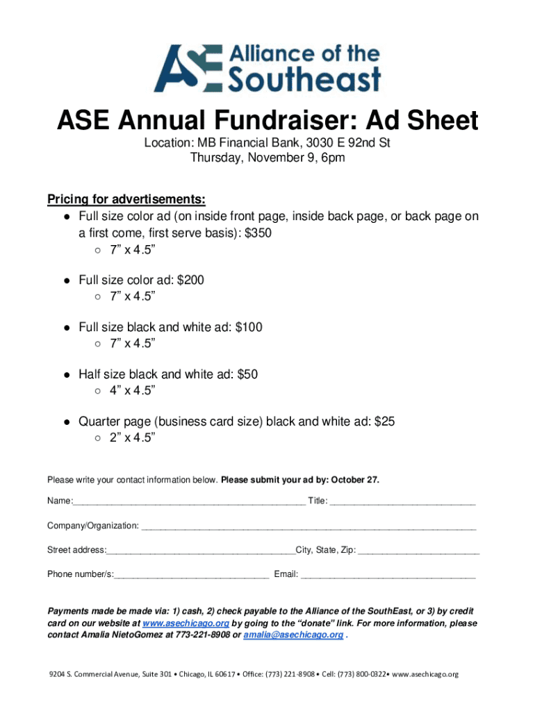 ASE Annual Fundraiser: Ad Sheet Location: MB Financial Bank, 3030 E 92nd St Thursday, November 9, 6pm Pricing for advertisements: Full size color ad (on inside front page, inside back page, or back