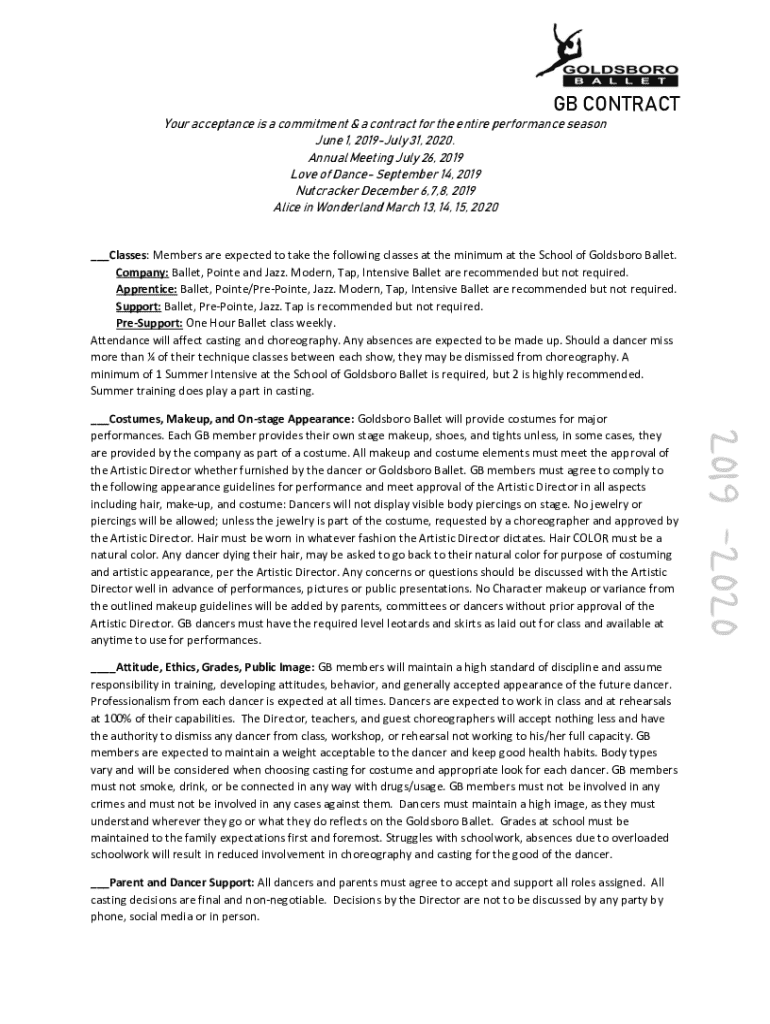 GB CONTRACTYour acceptance is a commitment & a contract for the entire performance season June 1, 2019July 31, 2020. Annual Meeting July 26, 2019 Love of Dance September 14, 2019 Nutcracker December