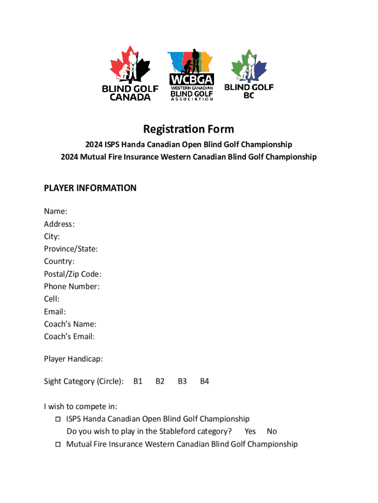Register for the 2024 ISPS Hand Canadian Open and Western Canadian Blind Golf Championships. Complete the form, provide player info, and sign up for practice rounds and accommodations.
