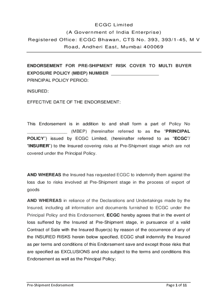 This endorsement provides additional risk coverage at the pre-shipment stage for exporters under the Multi Buyer Exposure Policy, addressing various insured and excluded risks.