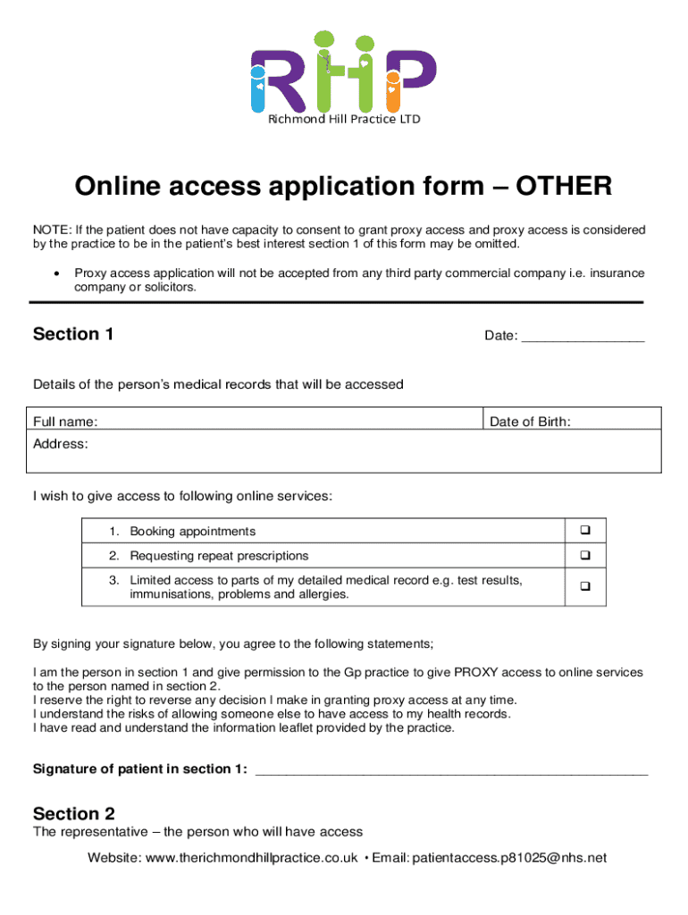 Apply for proxy access to online services at Richmond Hill Practice. This form allows designated representatives to manage patient\'s appointments, prescriptions, and medical records securely.