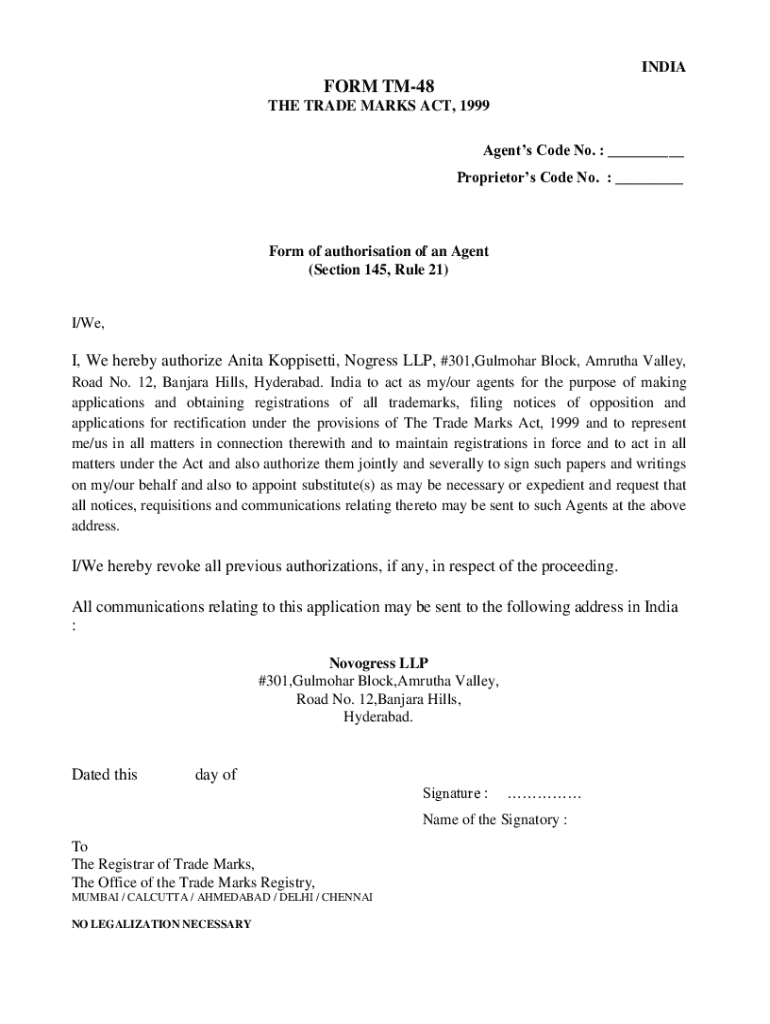 UNIFORM TM48 THE TRADE MARKS ACT, 1999 Agents Code No. ___ Proprietors Code No. ___Form of authorization of an Agent (Section 145, Rule 21)I/We, I, We hereby authorize Anita Koppisetti, Ogress LLP,