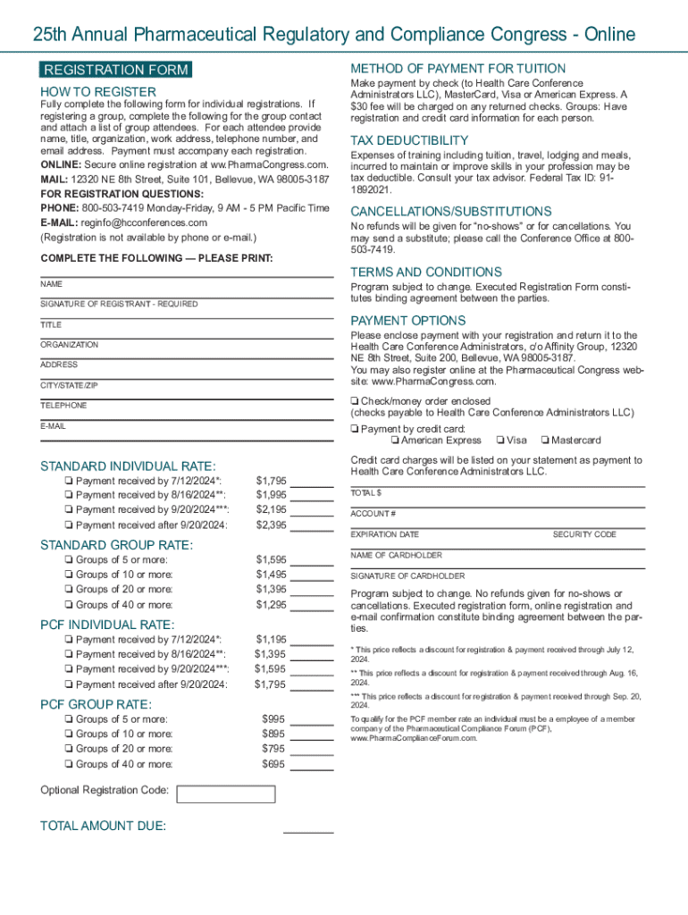 Register for the 2024 Pharmaceutical Regulatory and Compliance Congress online or by mail. Ensure your participation with secure payment options. Learn about deductions and terms.