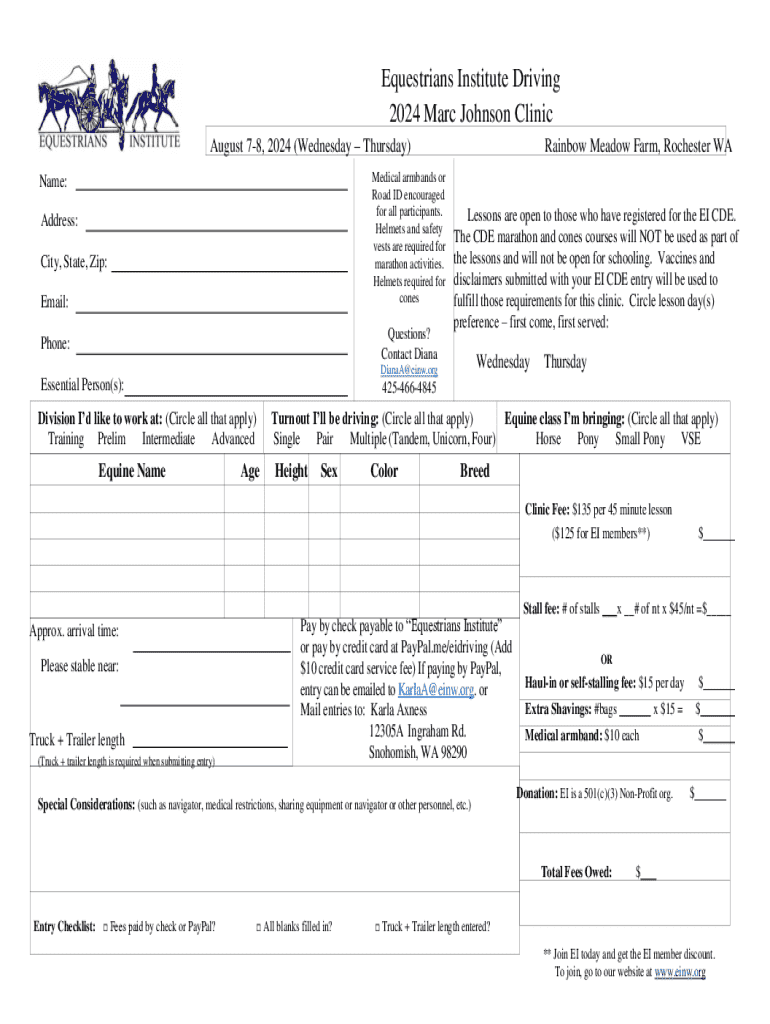 Join the 2024 Marc Johnson Clinic at Equestrians Institute Driving. Register for lessons in various divisions, ensuring safety and fun for all equestrians.