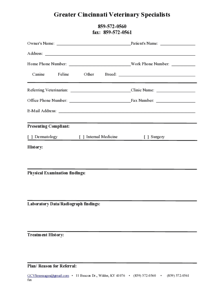 Veterinary referral form for specialties like dermatology, internal medicine, and surgery at Greater Cincinnati Veterinary Specialists. Contact details included.