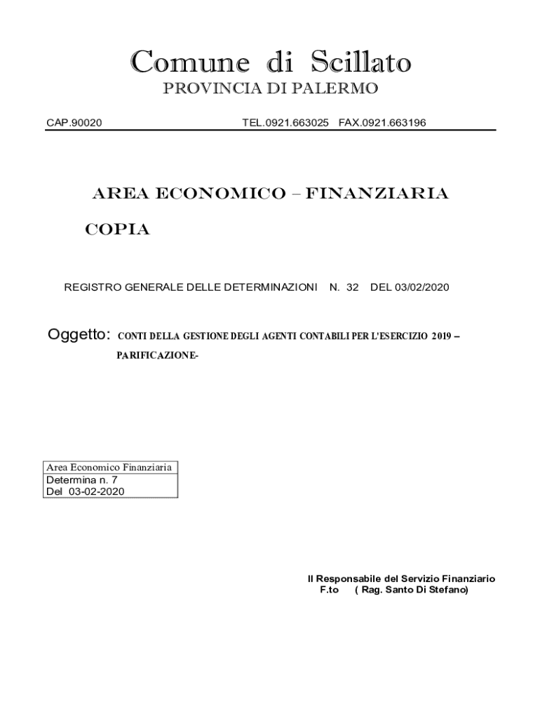 Comune di Scillato PROVINCIA DI PALERMO CAP.90020TEL.0921.663025 FAX.0921.663196AREA ECONOMICO FINANZIARIA COPIAREGISTRO GENERALE DELLE DETERMINAZIONIOggetto:N. 32DEL 03/02/2020CONTI DELLA GESTIONE