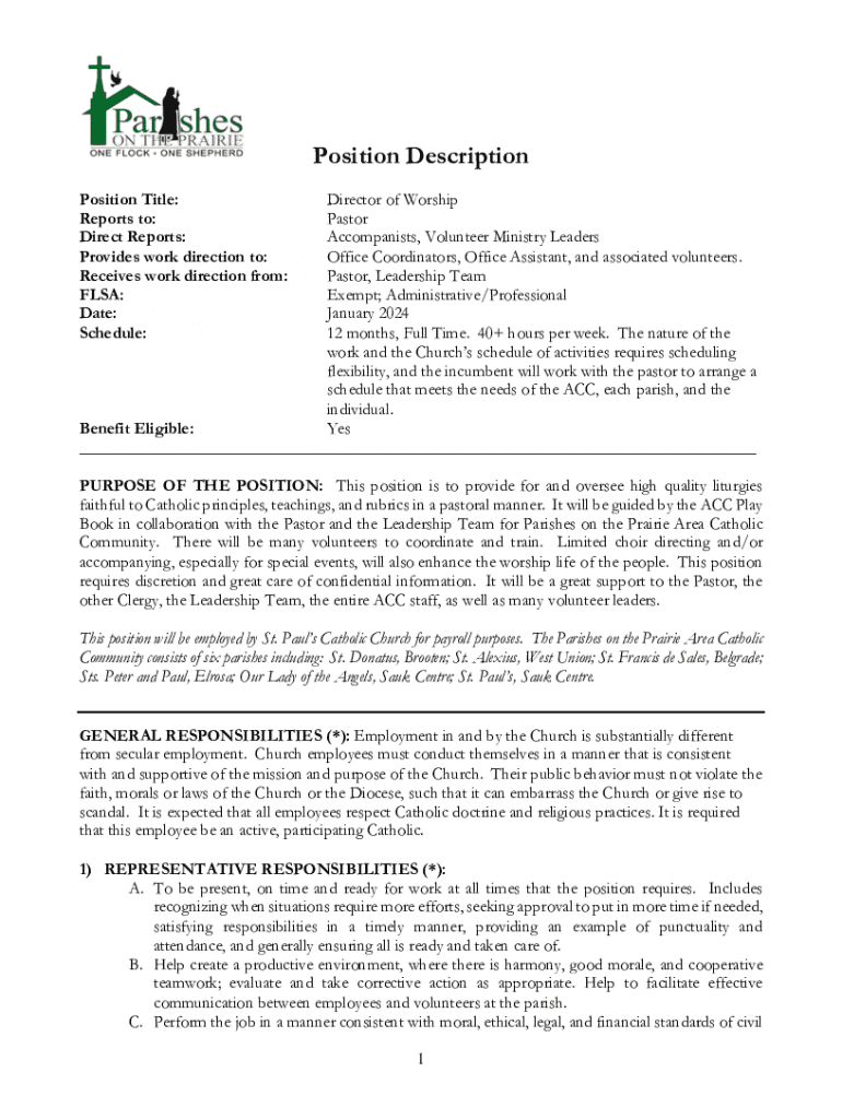 Position Description Position Title: Reports to: Direct Reports: Provides work direction to: Receives work direction from: FLSA: Date: Schedule:Director of Worship Pastor Accompanists, Volunteer Ministry