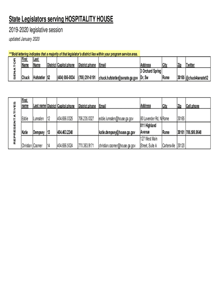 State Legislators serving HOSPITALITY HOUSE 20192020 legislative session updated January 2020REPRESENTATIVESSENATOR***Bold lettering indicates that a majority of that legislator\'s district lies within