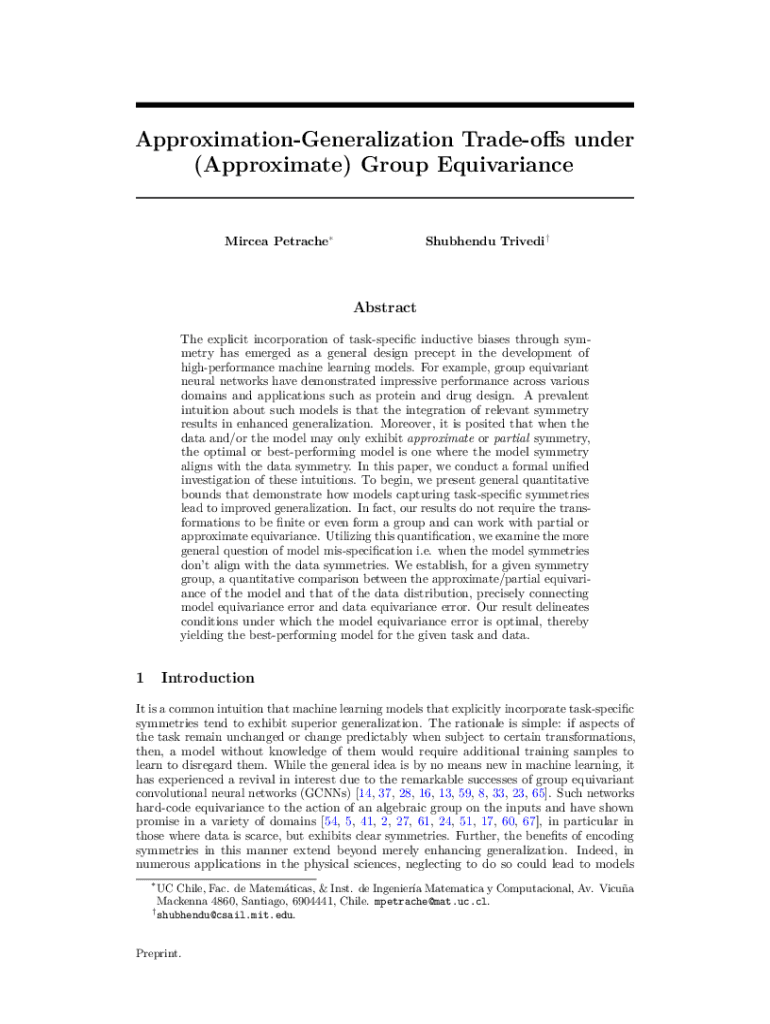 ApproximationGeneralization Tradeoffs under (Approximate) Group EquivarianceMircea PetracheShubhendu TrivediAbstract The explicit incorporation of taskspecific inductive biases through symmetry has