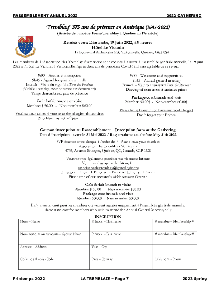 ASSEMBLYMEN ANNUAL 20222022 GATHERINGTremblay 375 ans de presence en Antique (16472022)
