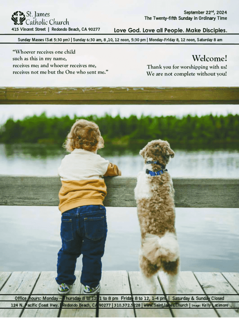 September 22nd, 2024 The Twentyfifth Sunday in Ordinary Time 415 Vincent Street | Redondo Beach, CA 90277Love God. Love all People. Make Disciples.Sunday Masses (Sat 5:30 pm) | Sunday 6:30 am, 8 ,10,