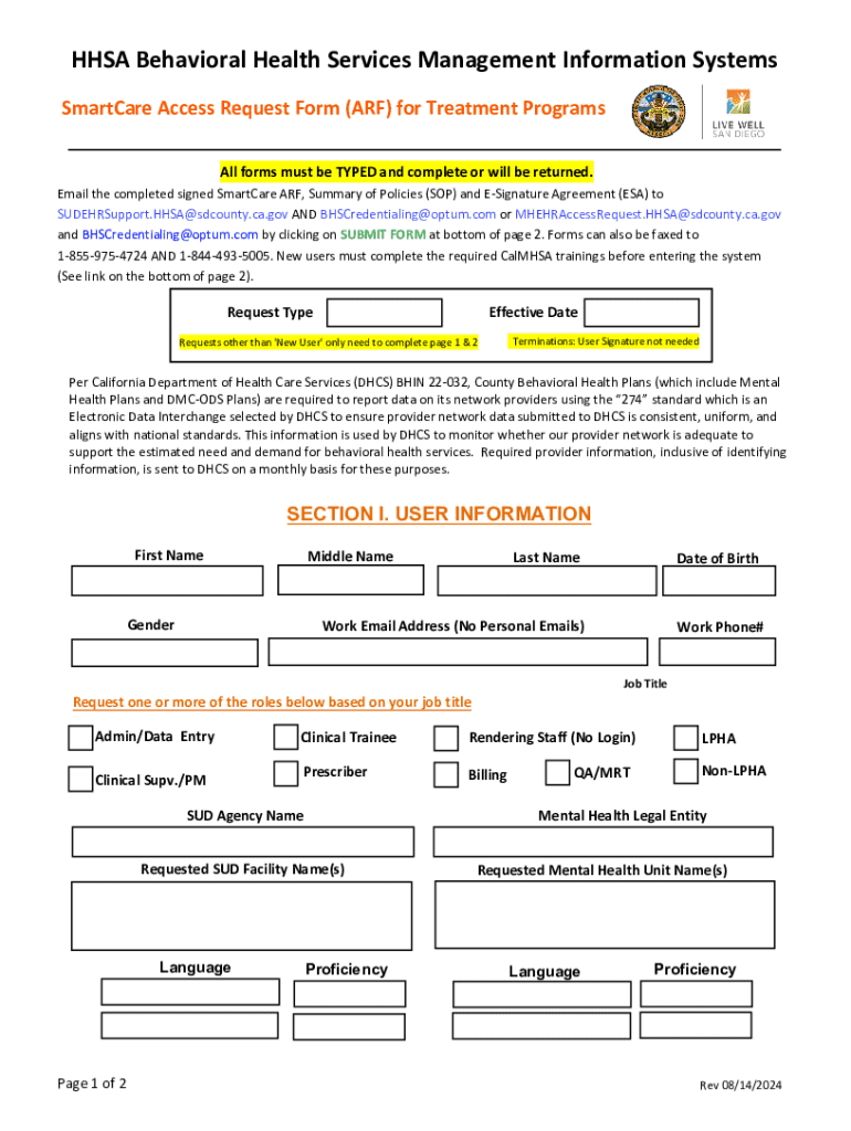 Complete the 2024 Smarter Access Request Form for behavioral health programs. Ensure all fields are typed and submit via email or fax for processing.