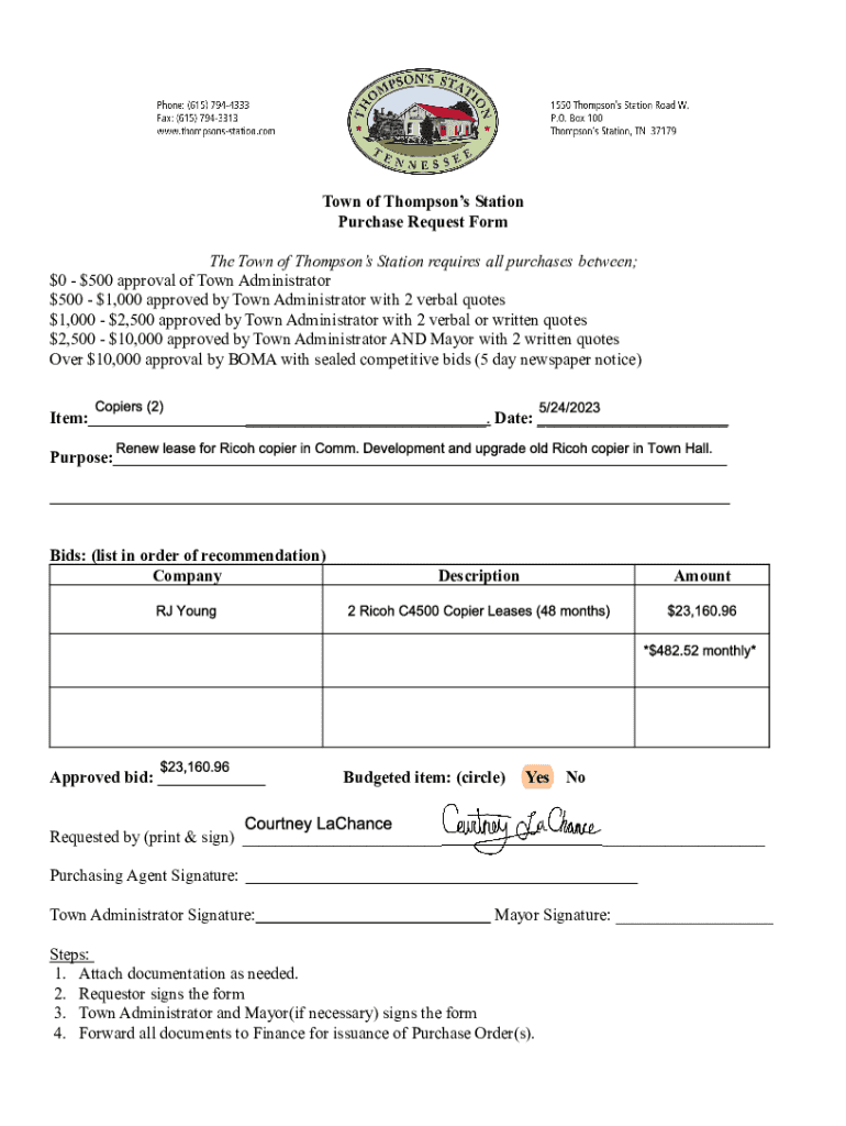 Town of Thompsons Station Purchase Request Form The Town of Thompsons Station requires all purchases between; $0 $500 approval of Town Administrator $500 $1,000 approved by Town Administrator with
