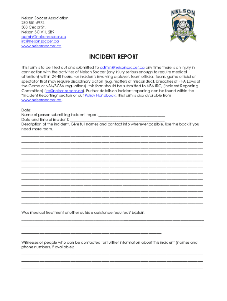 Nelson Soccer Association 2505516974 308 Cedar St. Nelson BC V1L 2B9 admin@nelsonsoccer.ca irc@nelsonsoccer.ca www.nelsonsoccer.caINCIDENT REPORT This form is to be filled out and submitted to admin@nelsonsoccer.ca