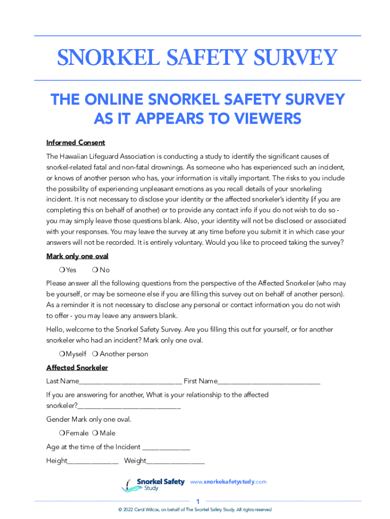 SNORKEL SAFETY SURVEY THE ONLINE SNORKEL SAFETY SURVEY AS IT APPEARS TO VIEWERS Informed Consent The Hawaiian Lifeguard Association is conducting a study to identify the significant causes of snorkel