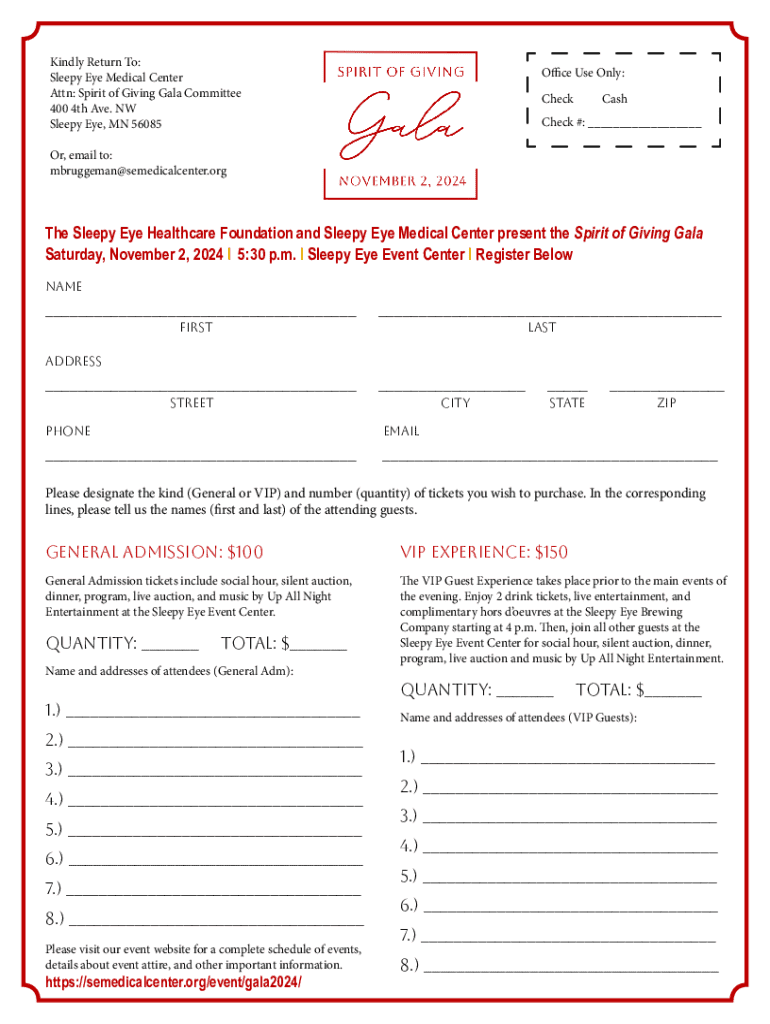 Kindly Return To: Sleepy Eye Medical Center Attn: Spirit of Giving Gala Committee 400 4th Ave. NW Sleepy Eye, MN 56085Office Use Only: CheckCashCheck #: ___Or, email to: mbruggeman@semedicalcenter.orgThe
