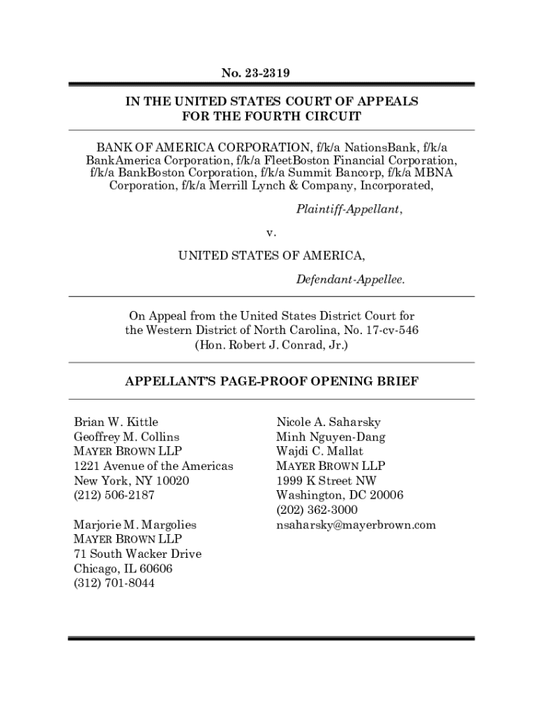 No. 232319 IN THE UNITED STATES COURT OF APPEALS FOR THE FOURTH CIRCUIT BANK OF AMERICA CORPORATION, f/k/a NationsBank, f/k/a BankAmerica Corporation, f/k/a FleetBoston Financial Corporation, f/k/a