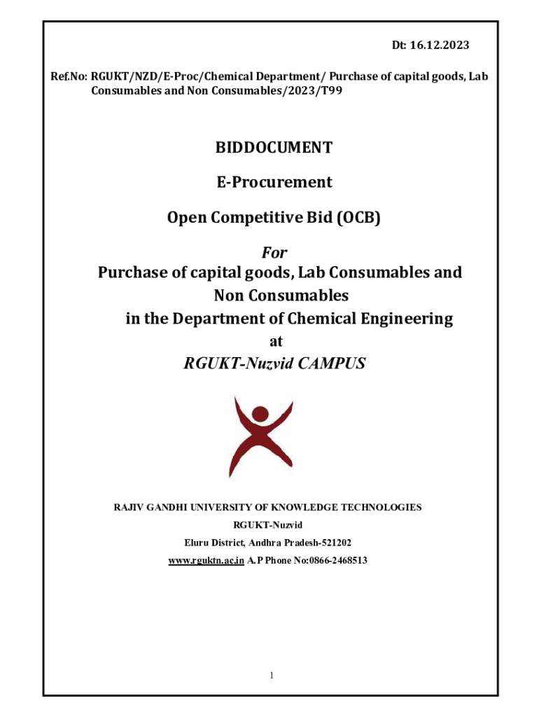 Dt: 16.12.2023 Ref.No: RGUKT/NZD/EProc/Chemical Department/ Purchase of capital goods, Lab Consumables and Non Consumables/2023/T99BIDDOCUMENT EProcurement Open Competitive Bid (OCB) For Purchase