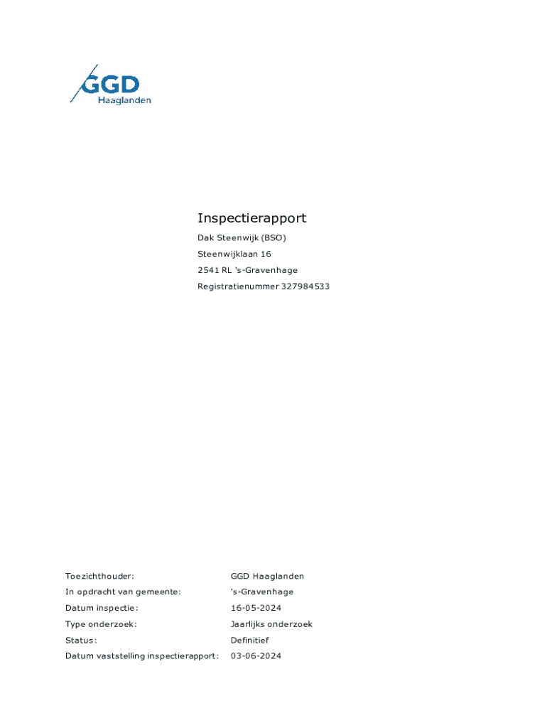 Registratienummer 327984533Toezichthouder:GOD HaaglandenIn Oprah van generate:\'sGravenhageDatum inspection:16052024Type