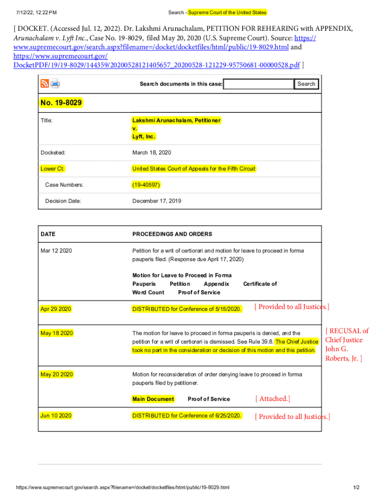 7/12/22, 12:22 PMSearch Supreme Court of the United States[ DOCKET. (Accessed Jul. 12, 2022). Dr. Lakshmi Arunachalam, PETITION FOR REHEARING with APPENDIX, Arunachalam v. Lyft Inc., Case No. 198029,