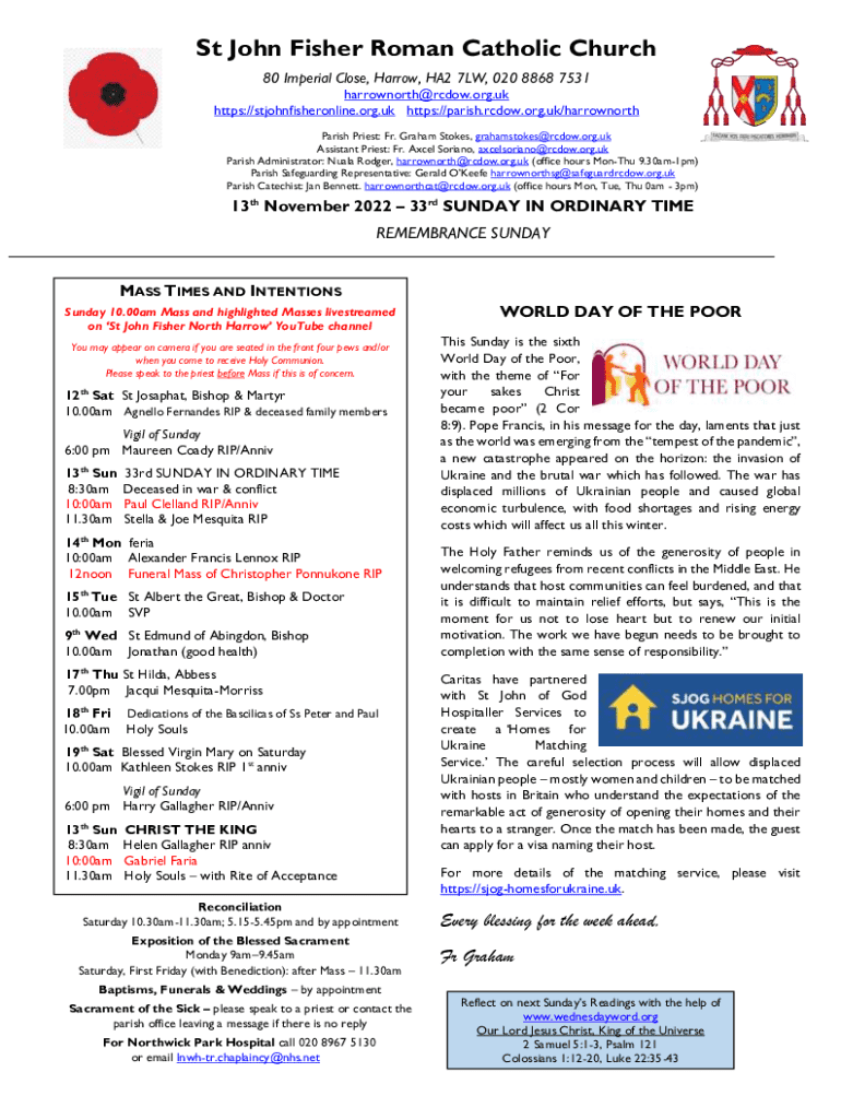 St John Fisher Roman Catholic Church 80 Imperial Close, Harrow, HA2 7LW, 020 8868 7531 harrownorth@rcdow.org.uk https://stjohnfisheronline.org.uk https://parish.rcdow.org.uk/harrownorth Parish Priest: