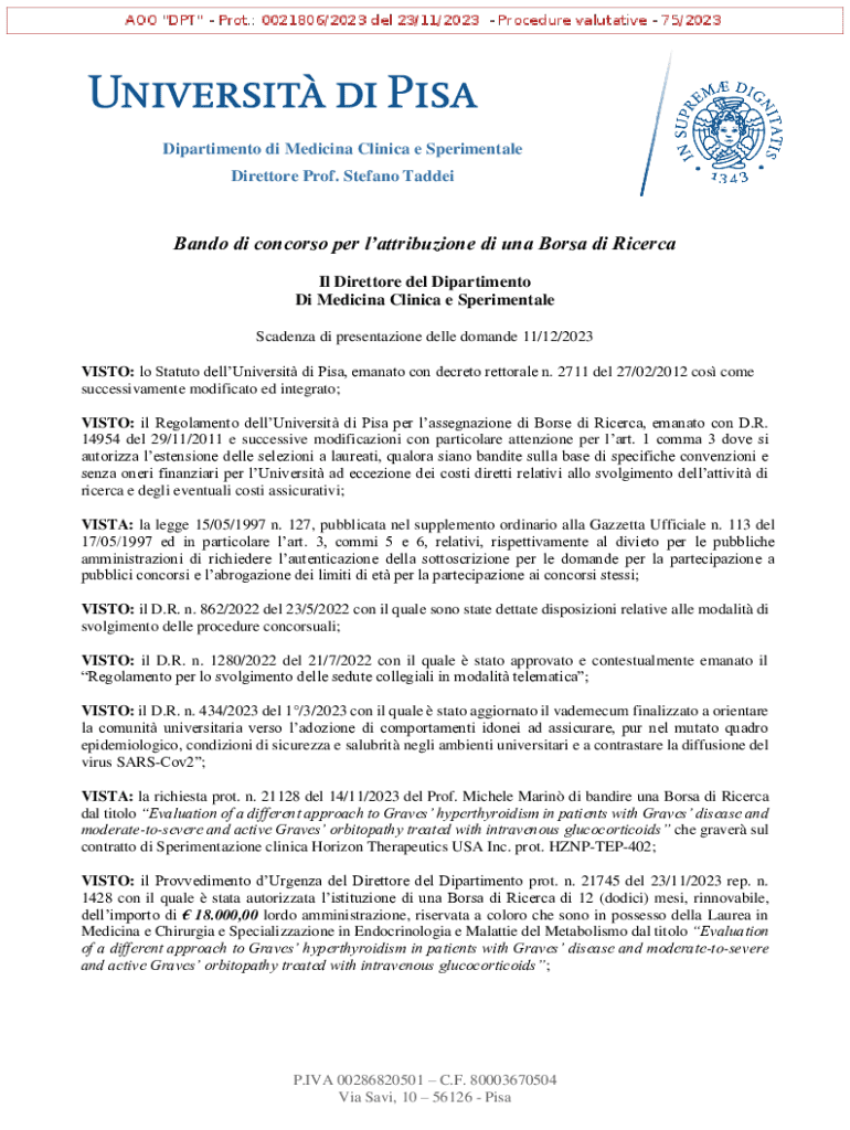 Director Prof. Stefano TaddeiBando DI concerto per attribution DI RNA Bursa di Ricer ca