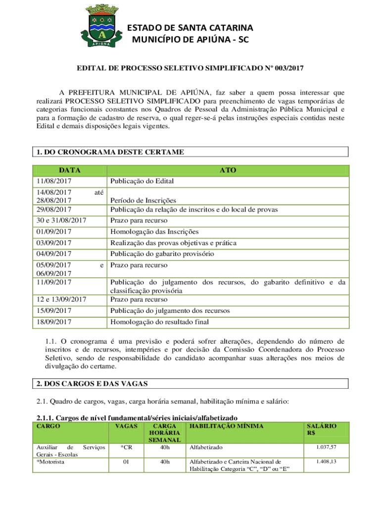 EDIT AL DE PROCESS SELECTIVE SIMPLIFIED N 003/2017A PREFECTURE MUNICIPAL DE APIA, FAZ saber a IUEM fossa intercessor Que