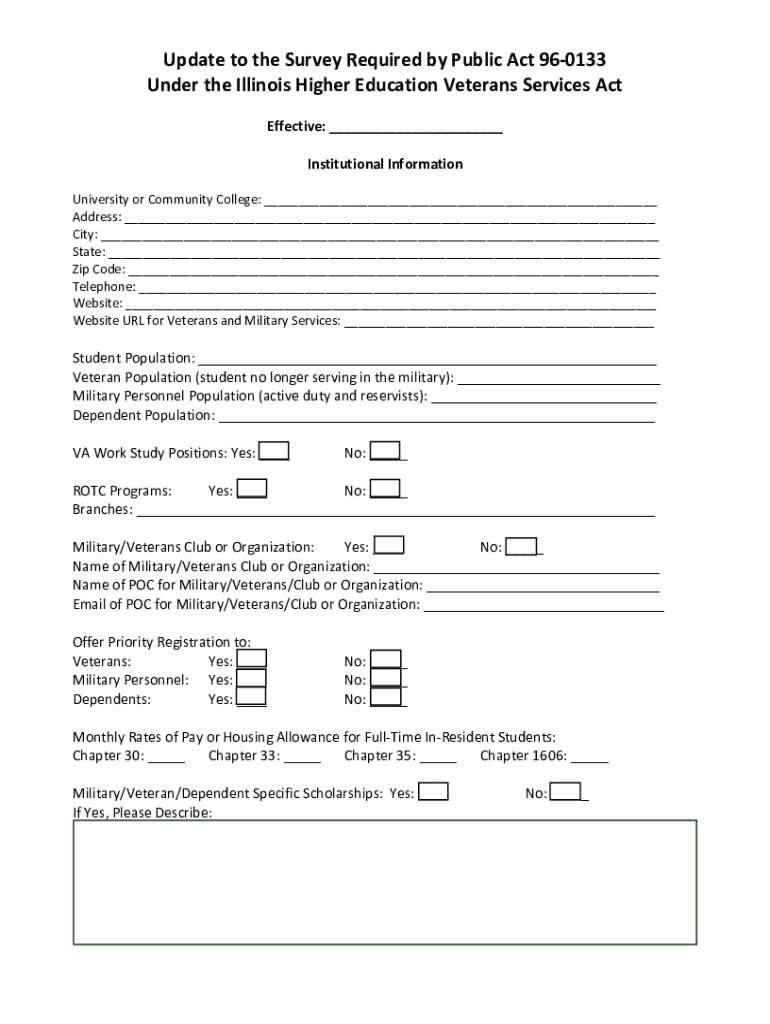 Update to the Survey Required by Public Act 960133 Under the Illinois Higher Education Veterans Services Act Effective: ___ Institutional Information University or Community College: ___ Address: