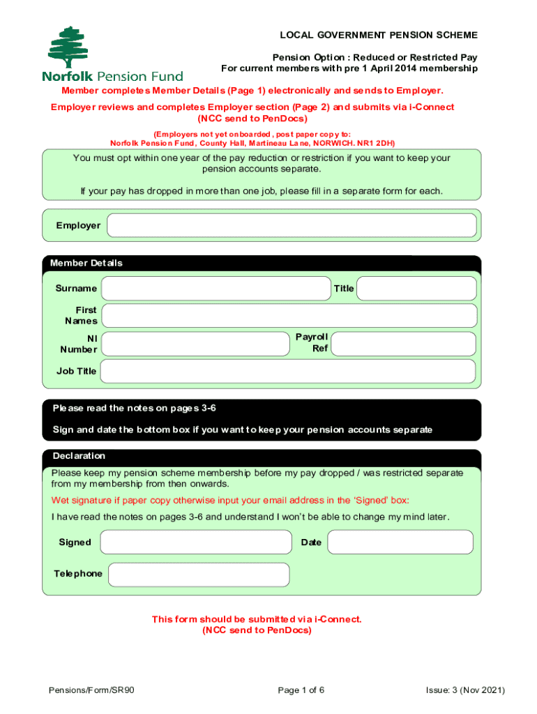 LOCAL GOVERNMENT PENSION SCHEME Pension Option : Reduced or Restricted Pay For current members with pre 1 April 2014 membership Member completes Member Details (Page 1) electronically and sends to