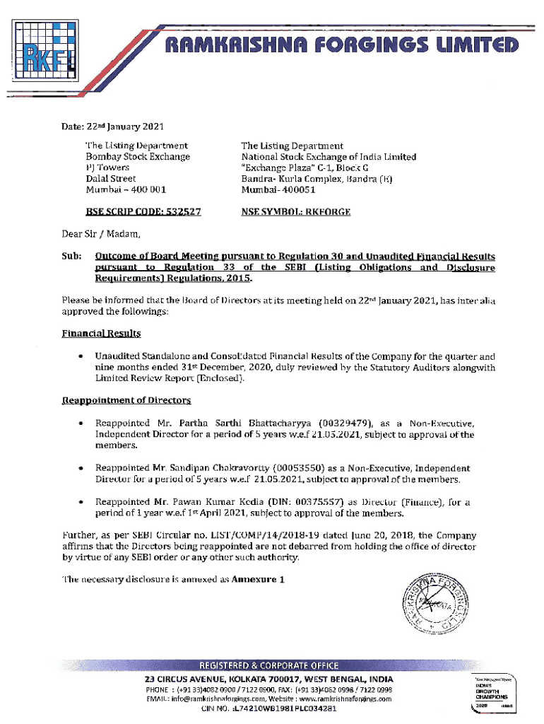 Details the outcomes from the Board meeting of Ramakrishna Forgings Limited including unaudited financial results for the quarter ended December 31, 2020.