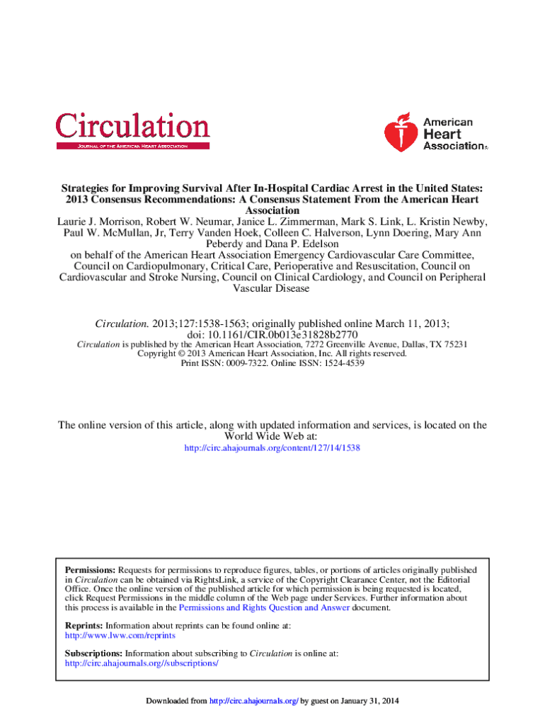 Strategies for Improving Survival After InHospital Cardiac Arrest in the United States: 2013 Consensus Recommendations: A Consensus Statement From the American Heart Association Laurie J. Morrison, Robert W. Neumar, Janice L. Zimmerman, Mark S. Link, L. Kristin Newby, Paul W. McMullan, Jr, Terry Vanden Hoek, Colleen C. Halverson, Lynn Doering, Mary Ann Peberdy and Dana P. Edelson on behalf of the American Heart Association Emergency Cardiovascular Care Committee, Council on Cardiopulmonary,...